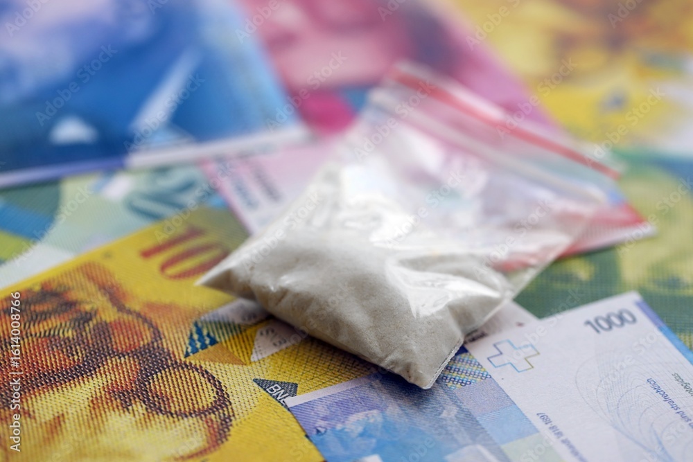 Swiss franc banknotes and cocaine pack. The current francs money bills and narcotic substance