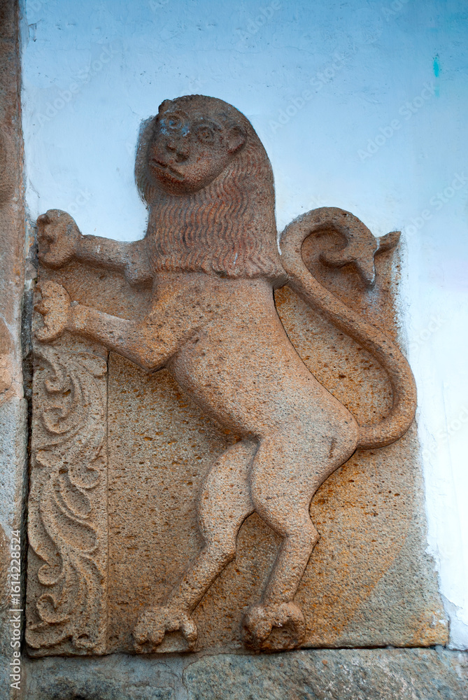 Close-up of hand-carved stone lion relief on a colonial wall in Antigua Guatemala. The historic detail captures cultural heritage and craftsmanship in natural textured stone.