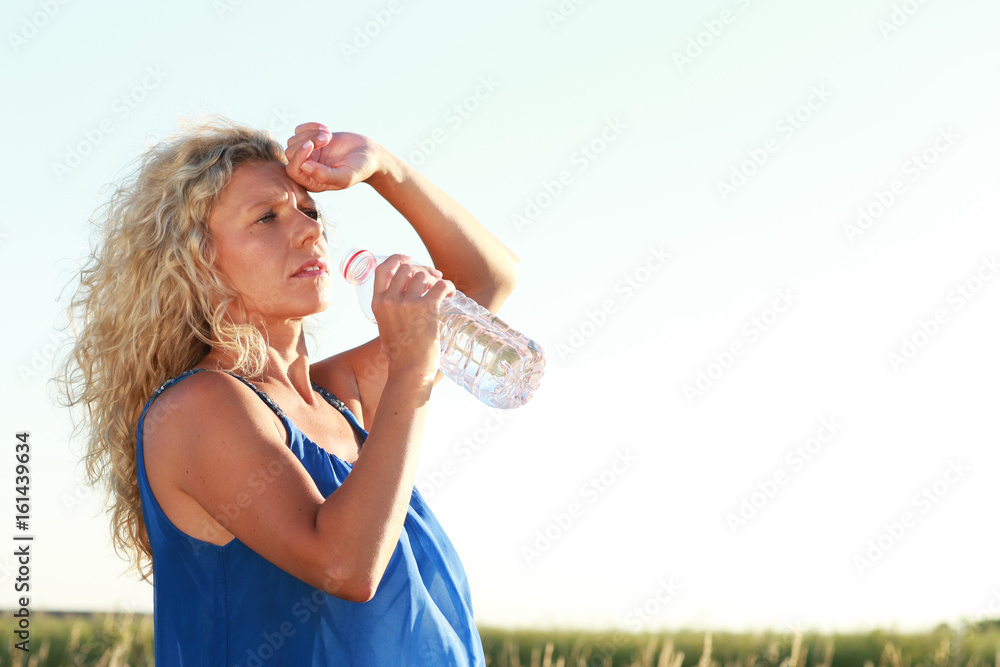 Frau mittleren Alters trinkt Mineralwasser im Sommer bei Hitze
