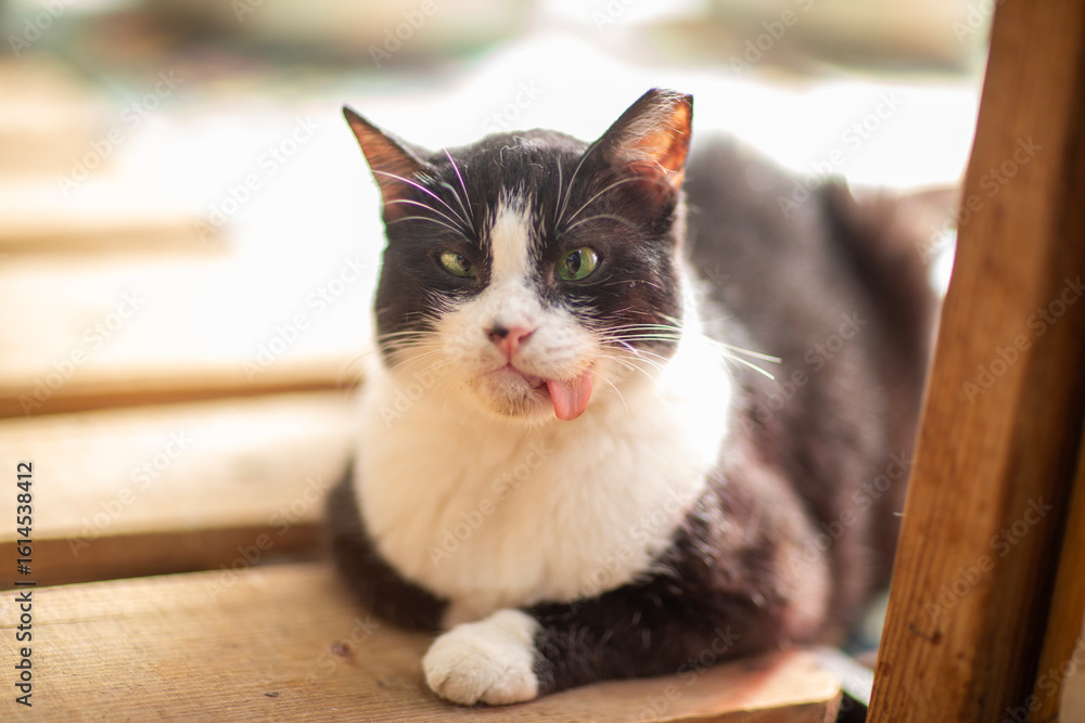 a funny cat with its tongue sticking out and crossed eyes closeup poto