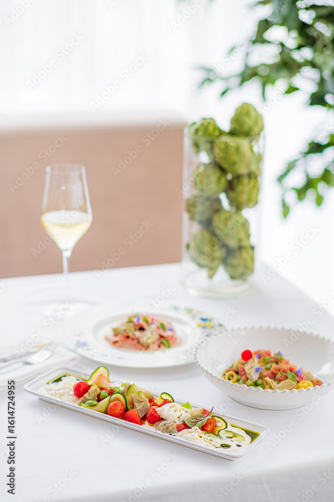 An elegant table displays vibrant dishes and wine, forming a delightful culinary scene