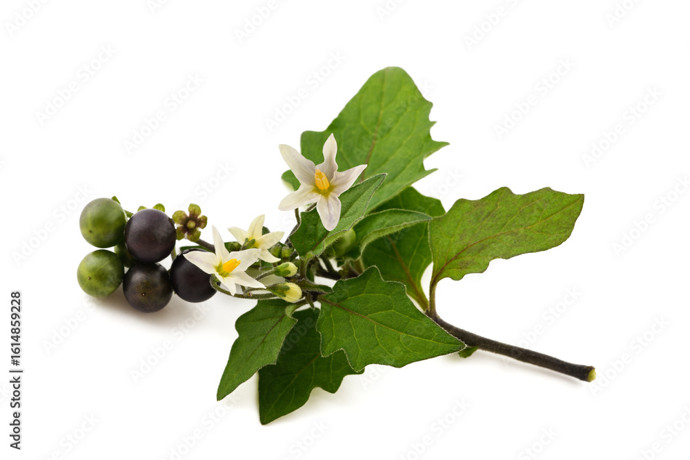 Black nightshade branch with flowers and berry