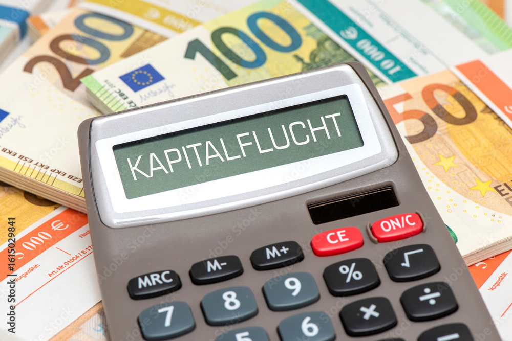 Ein Taschenrechner mit dem Wort Kapitalflucht im Display steht auf vielen Bündel mit Euro Bargeld