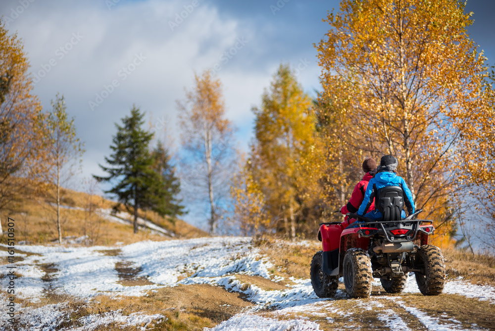 Rear view. Couple having fun on snow-covered road while driving a quad bike on a sunny day with blurred background nature
