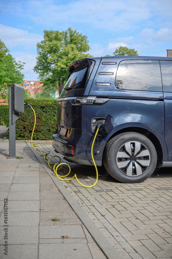 Electric minivan charges at a public EV station in an urban setting with a plugged yellow cable. Transition to eco-friendly mobility and the rise of green transportation in Europe’s cityscapes.
