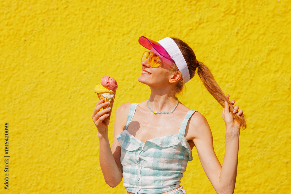 Happy Young Woman with Ice Cream Cone on Bright Yellow Wall Enjoying Sunny Summer Day