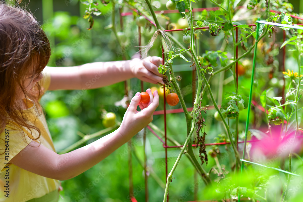 Toddler Girl Picking Tomatoes in the Family Garden Early Childhood Involvement in Gardening, hands-on learning, and the beauty of homegrown food. Themes of homeschooling, sustainable living