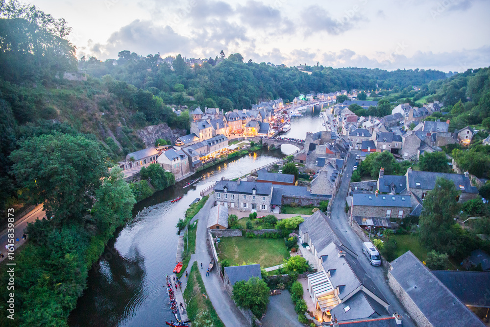 Panoramic view at twilight of the harbor in Dinan city, for the traditional fireworks spectacle