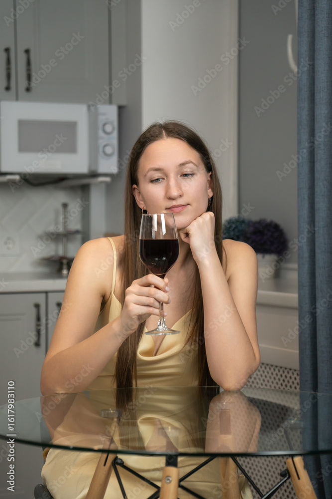 Young woman in elegant dress sitting at glass table in modern kitchen, holding glass of red wine, feeling lonely and depressed, dealing with emotional stress and anxiety. Vertical photo
