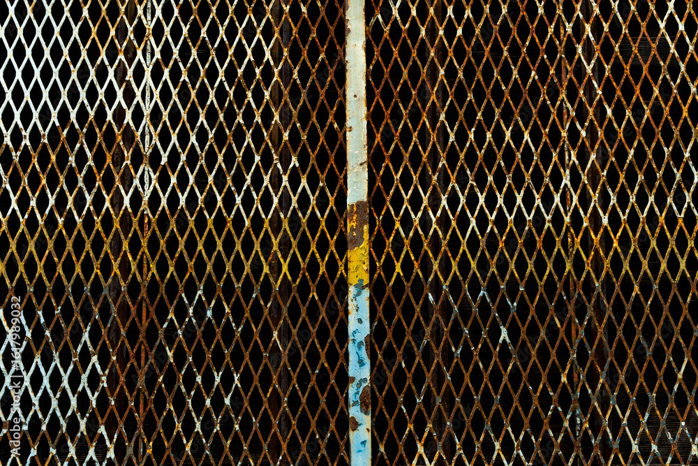 Close-up of an old locomotive and old carriages on a decommissioned railway, the paint cracked, peeled and rusted.