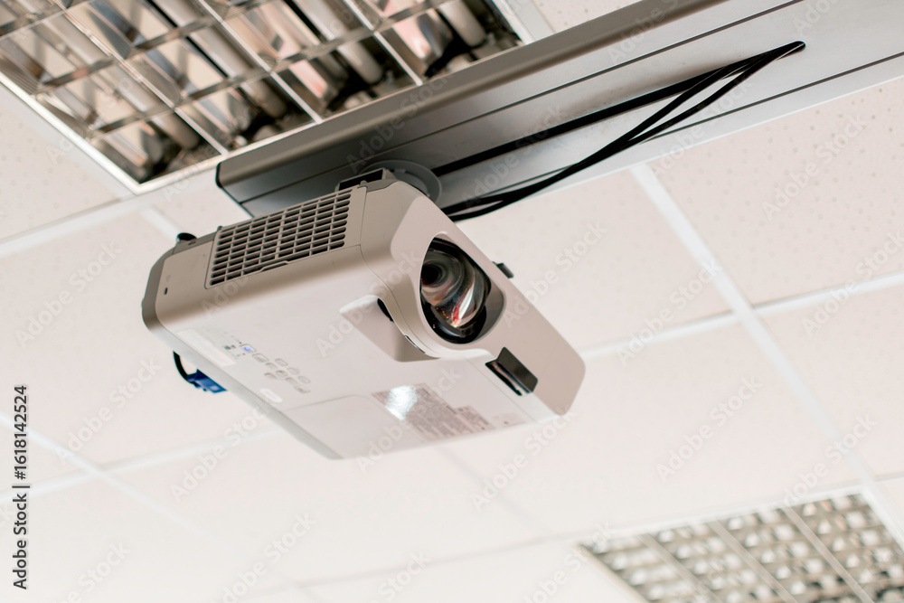 A projector suspended from the ceiling. Used to display images, videos or other content on a large surface.