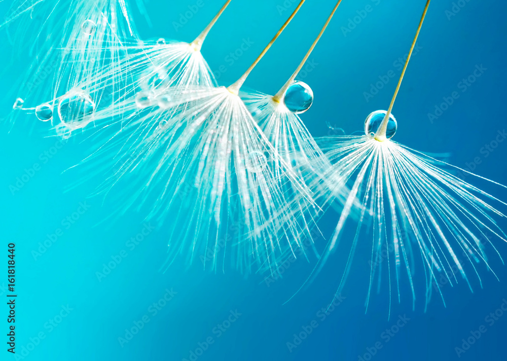 Seeds of dandelion flowers with drops of dew rain water on blue sky macro background.