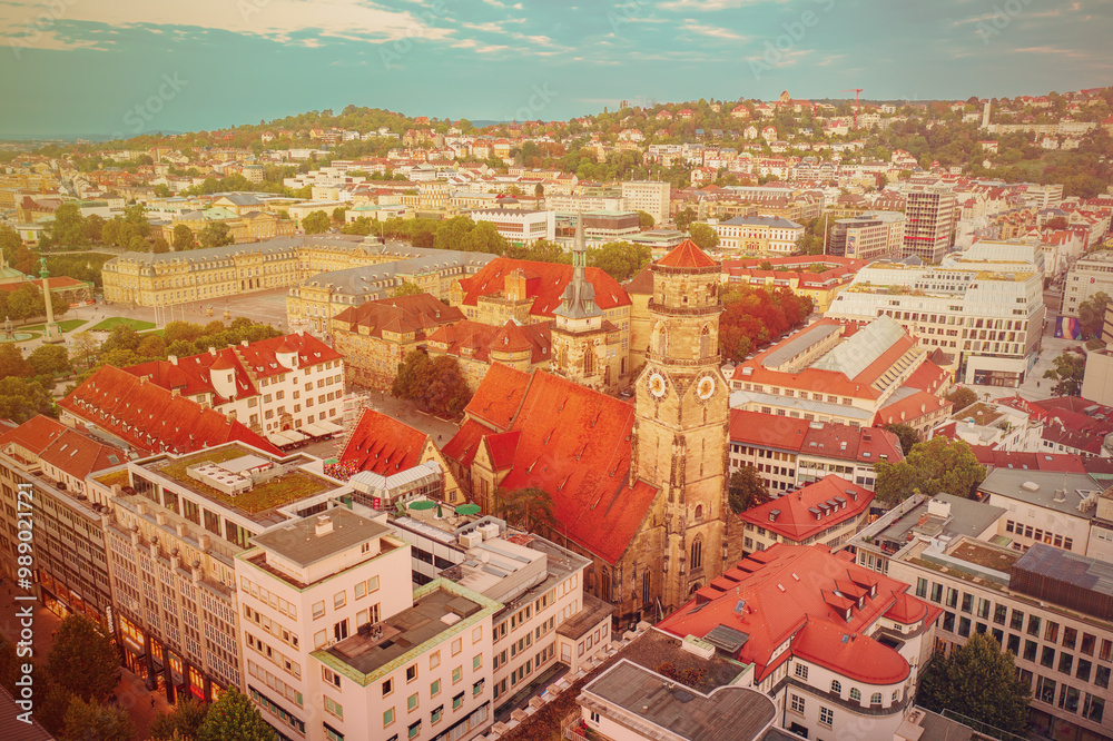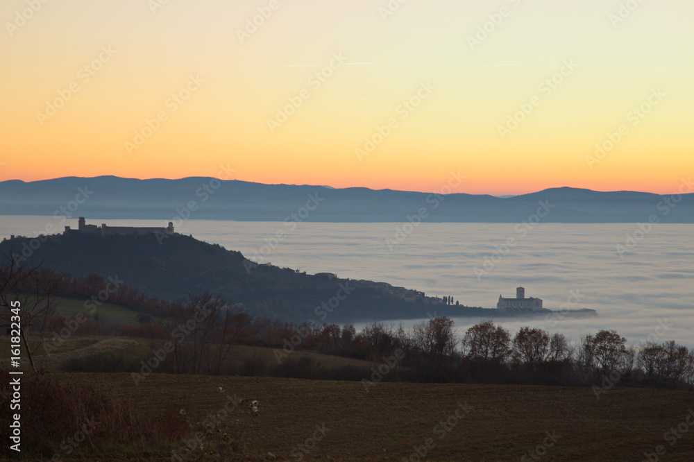 A view of Assisi town and St.Francis church over a sea of fog, with warm sunset colors and trees in the foreground