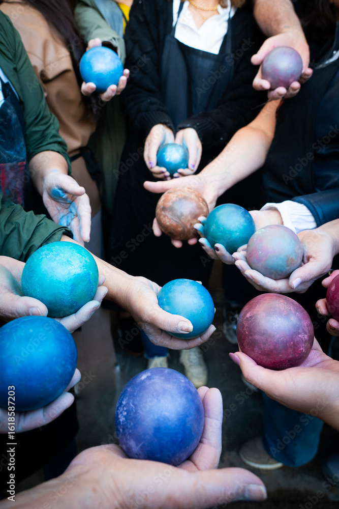 Multiple hands hold spherical clay ornaments made using the dorodango technique