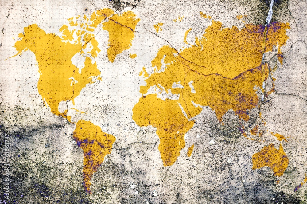 Yellow world map on damaged cracked concrete wall. Elements of this image furnished by NASA.
