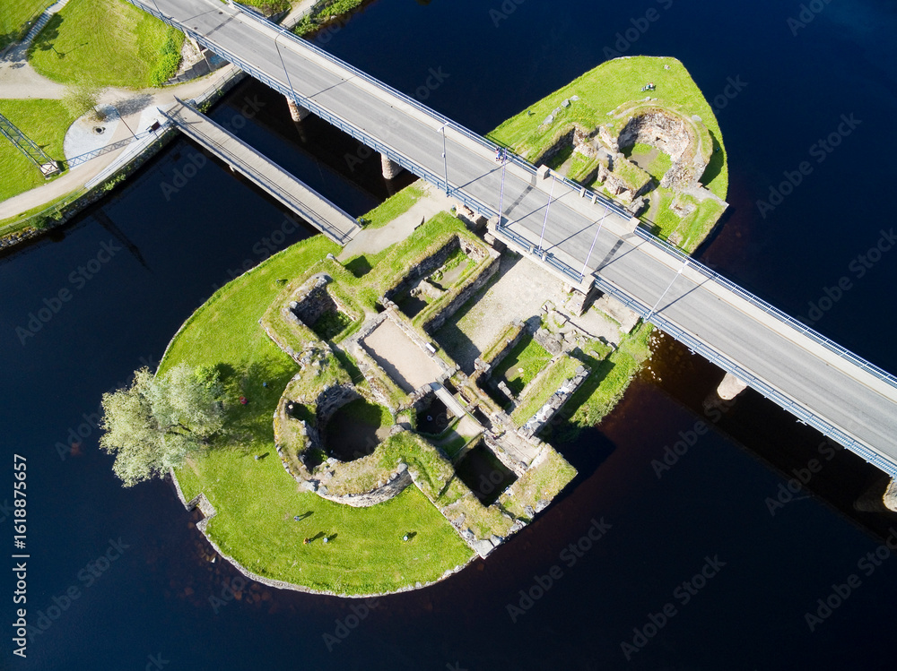 Aerial view of a ruined castle on an islet in the Kajaani River, Finland