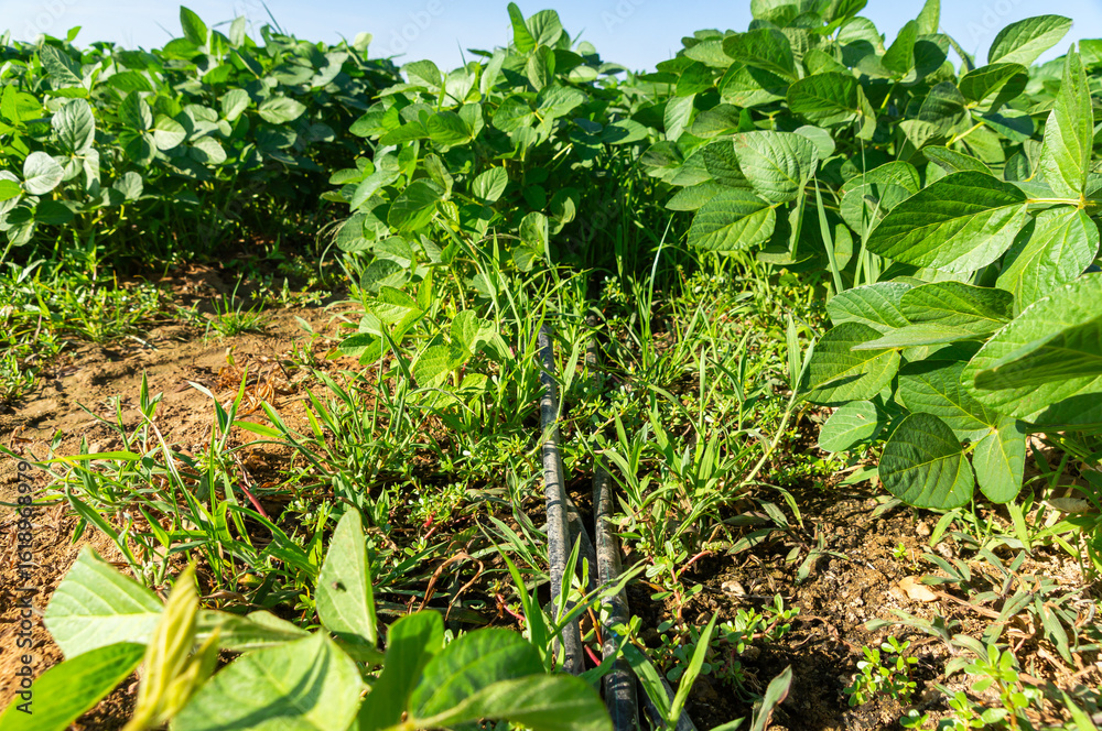 Agricultural Technology: Drip Irrigation Hose in a Soybean Field.