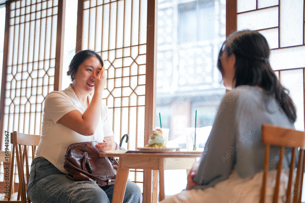 In a chic cafe by a window table, two Korean women in their twenties in casual clothes sit with drinks and sweets, laughing and chatting under soft spring light. Seoul, Jongno District, spring.