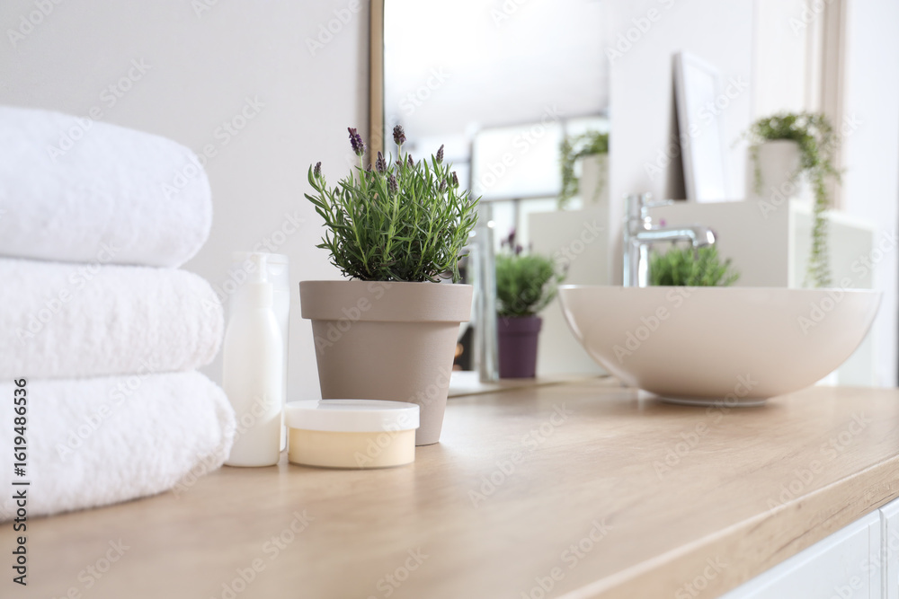 Pot with lavender flowers, towels and cosmetic products near sink in bathroom, closeup