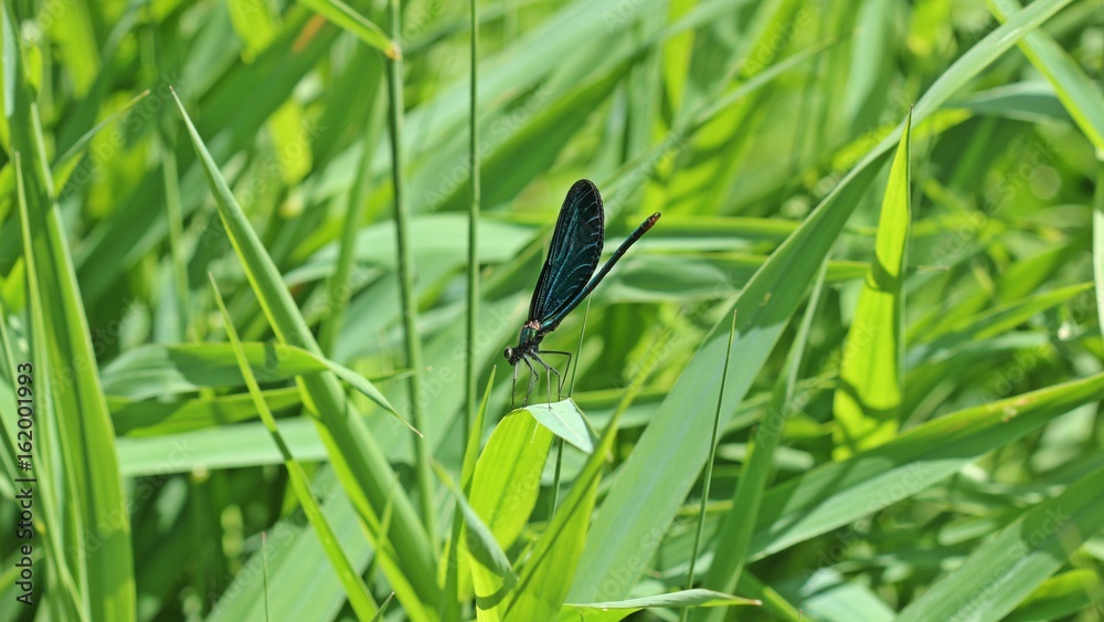Männliche Blauflügel-Prachtlibelle (Calopteryx virgo) auf Schilfhalm