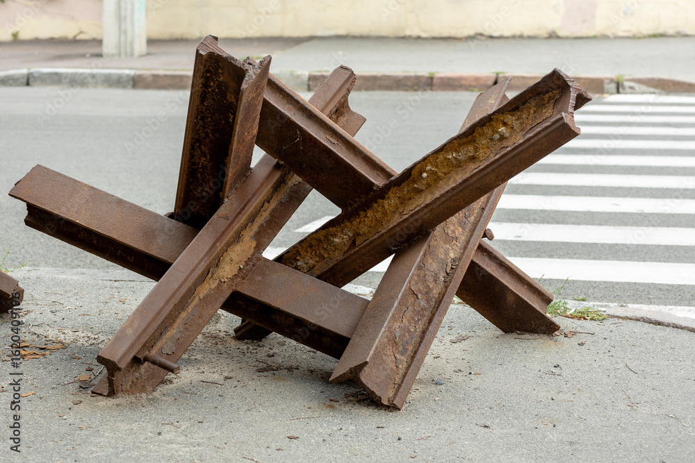 Rust-Covered Anti-Tank Barrier on City Street
