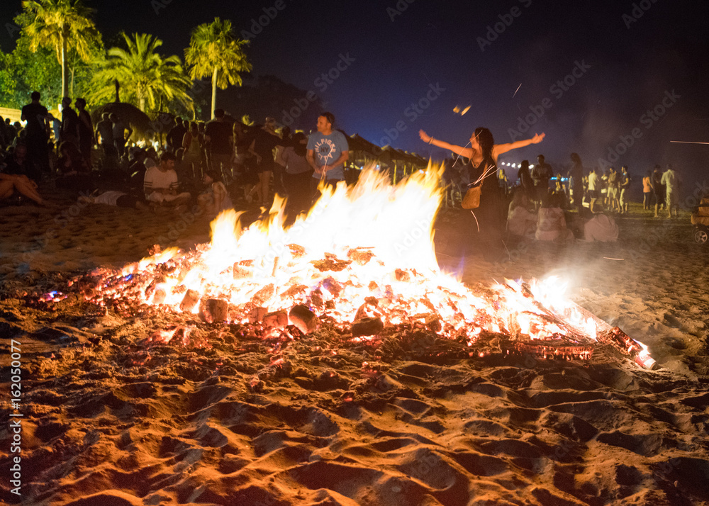 MARBELLA, SPAIN - JUNE 23, 2017: Celebrating San Juan on the beach in Marbella, Costa del Sol, Spain. Bonfires are lit and Flaming Lanterns released to mark the beginning of Summer