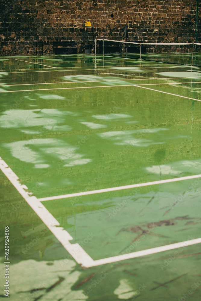A quiet tennis court in Heraklion, Greece, captured without players or distractions. The scene emphasizes clean lines, open space, and the geometry of play.