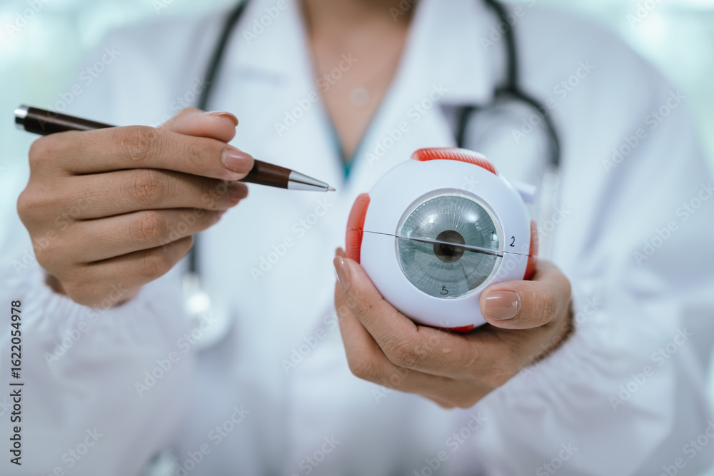 An Asian ophthalmologist examines an elderly patient's eyes for conditions like cataracts, glaucoma, and presbyopia during a vision checkup at a medical eye clinic.