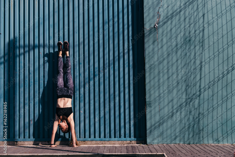 Full length portrait of athletic girl standing upside down posing on a blue wall. Sport and training. Sport tight clothes. Sporty girl. Fitness concepts. Outdoor
