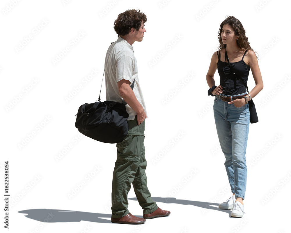 Two people standing casually in the street in sunlight and talking isolated on transparent and white background