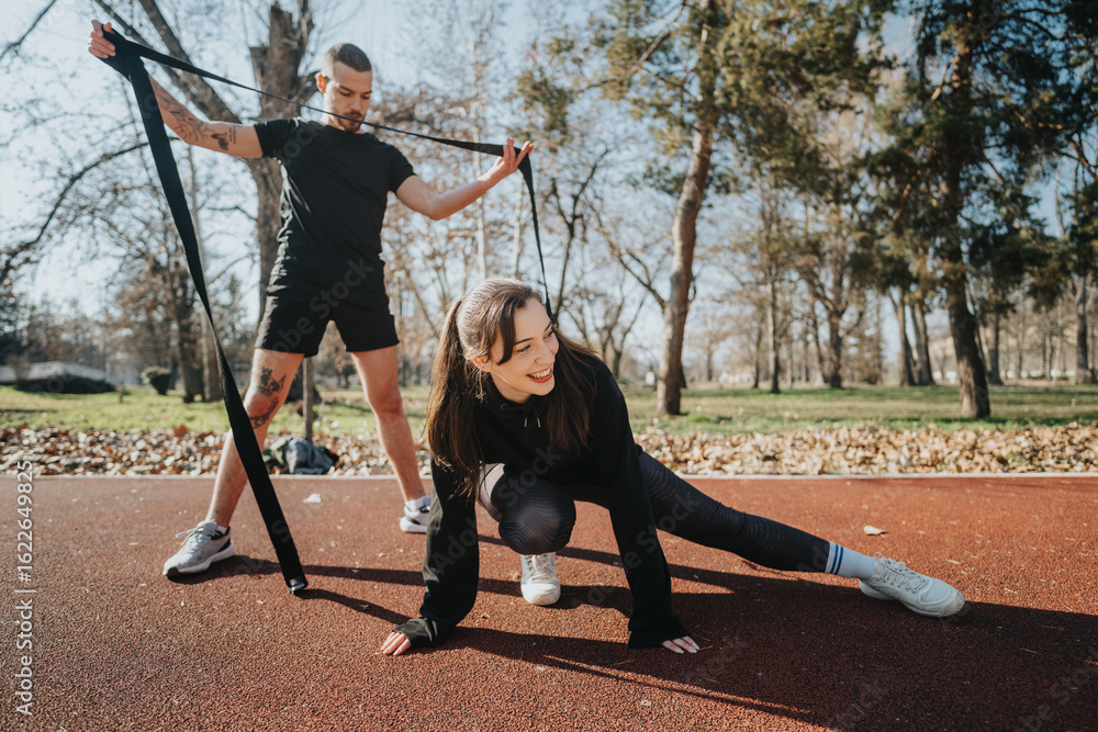 Two teenagers participate in a dynamic outdoor fitness activity, using a resistance band for stretching exercises.
