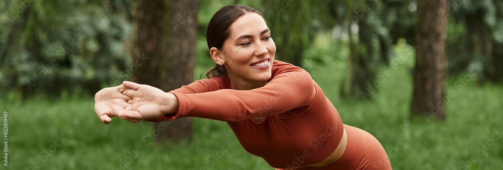 Beautiful young woman teaches yoga outdoors, embracing nature with grace and strength