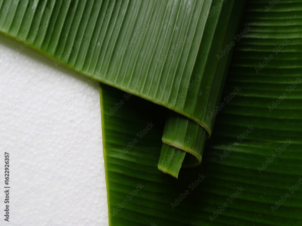Green banana leaf with a curled tip, isolated on a white background with copy space, suitable for themes like traditional Indonesian Asian food or natural art