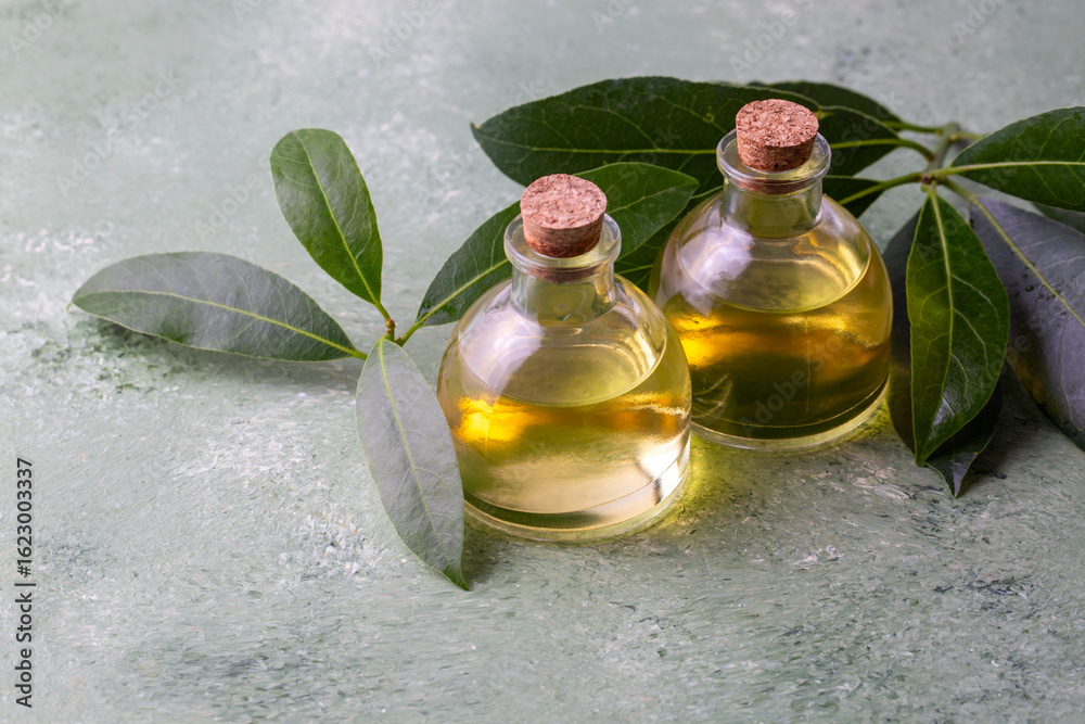 Glass bottle of essential bay laurel oil with daphne leaves on wooden rustic background. Healthy lifestyle spa, therapy concept