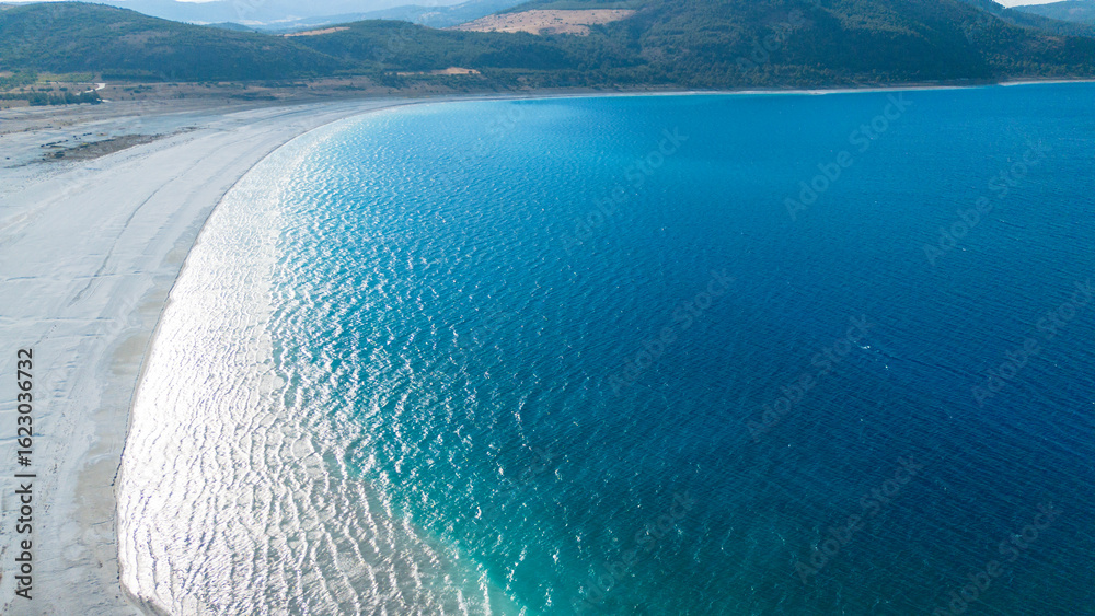 The tranquil beauty of Salda Lake - Turkey with its crystal clear turquoise waters and stunning surrounding landscapes is a mesmerizing sight to behold.