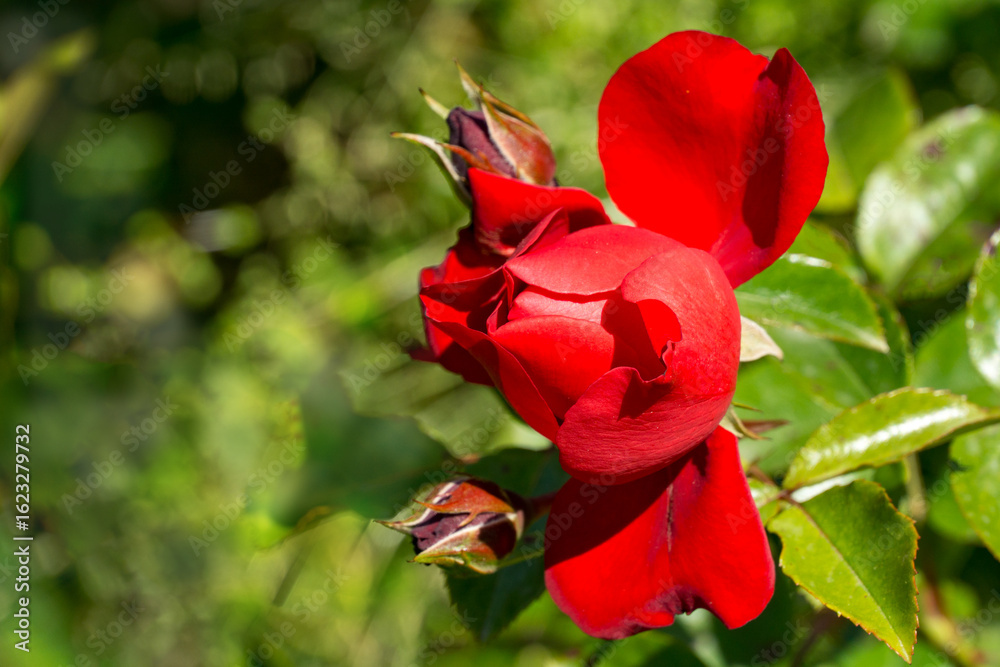 Stunning close-up of red rose 'Grand Hotel' in full bloom, showcasing its intricate petals, surrounded by green foliage, highlighting flower's delicate beauty and vivid details in natural setting
