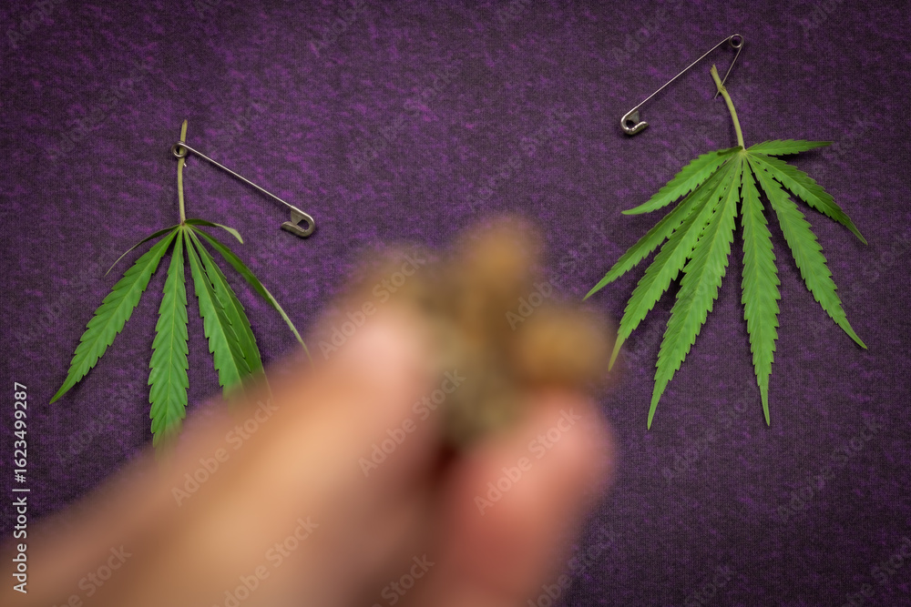 Dry blossom of medicinal marijuana flower in hand with violet background