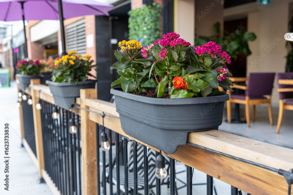 Outdoor cafe terrace with fresh flowers. Restaurant patio with flower pots on the fence in summer