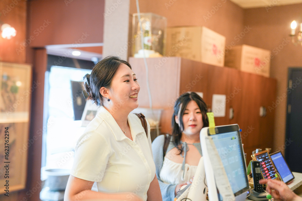 Two Korean women in their twenties in casual clothes pay at the register in a kalbi barbecue restaurant, smiling together as spring light filters through windows. Seoul Jung District June 21 2025.