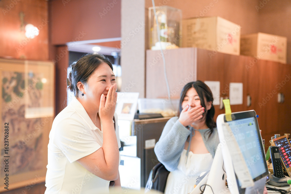 Two Korean women in their twenties in casual clothes pay at the register in a kalbi barbecue restaurant, smiling together as spring light filters through windows. Seoul Jung District June 21 2025.