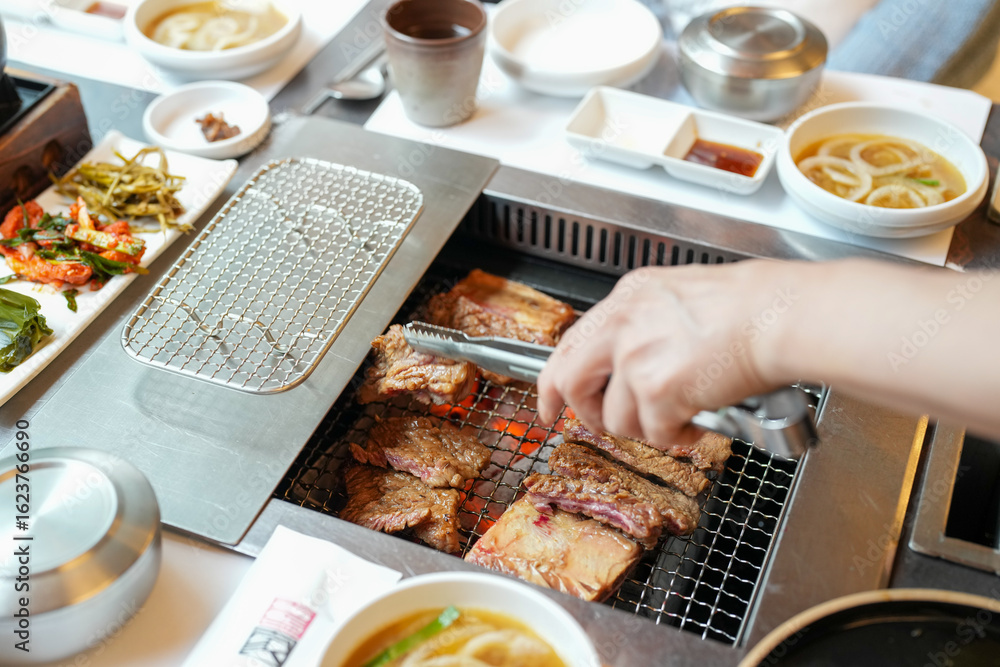 In a kalbi barbecue restaurant, a server grills a cut of meat over glowing coals, flames licking edges as steam rises from sizzling fat, filling the air with rich aroma. Seoul, Jung District, spring.