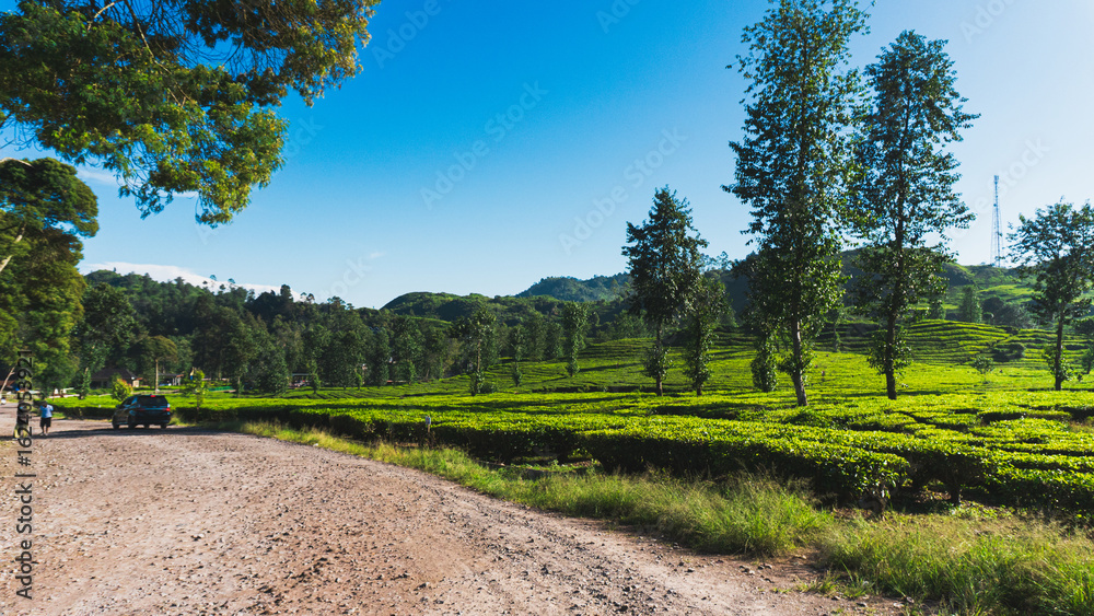 Beautiful scenic atmosphere with beautiful and freshness morning at Ciwidey Tea Plantation, West Java, Indonesia.