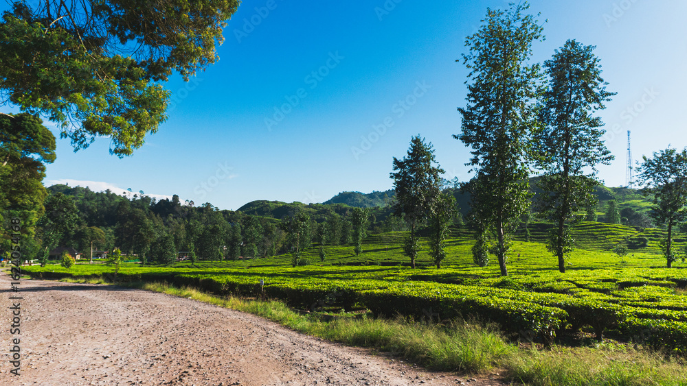 Beautiful scenic atmosphere with beautiful and freshness morning at Ciwidey Tea Plantation, West Java, Indonesia.