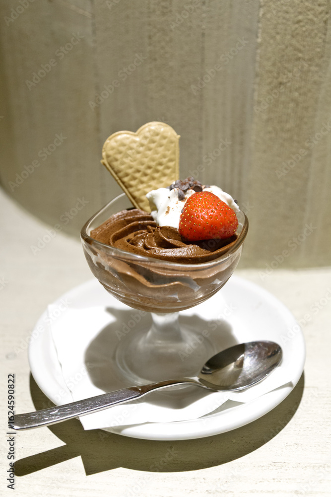 refreshing and tasty chocolate ice cream cup with fresh strawberry and heart shaped biscuit garnish