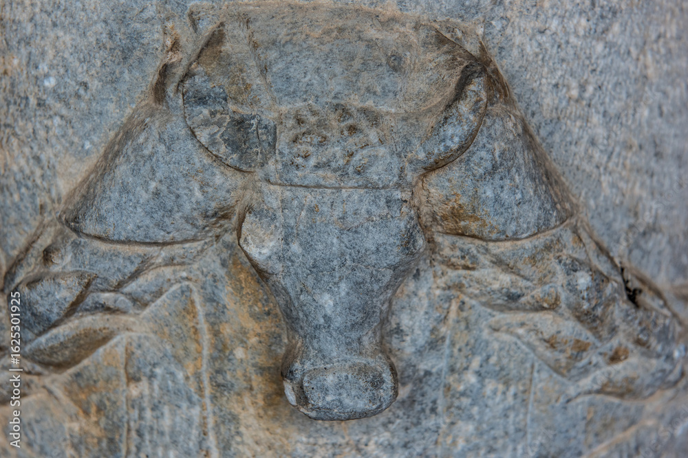 Greek sculpture of a bull. Greek elements of architectural decorations of buildings, columns