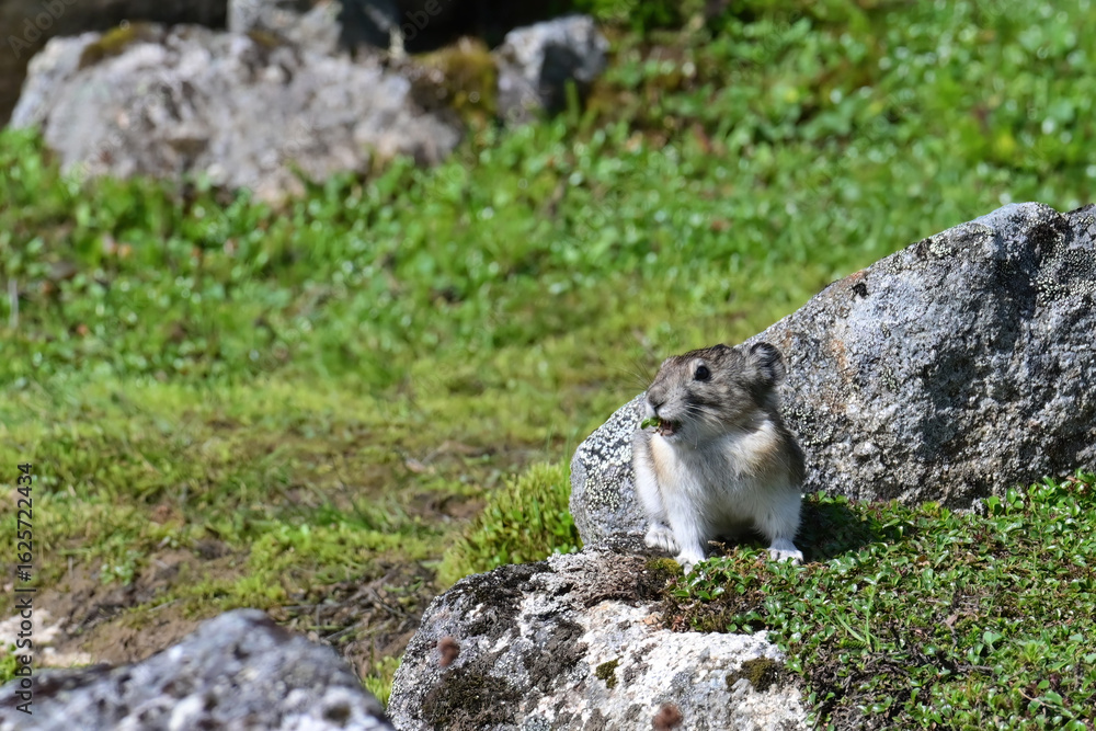 A Collared Pika (Ochotona collaris) pauses with fresh greenery it has gathered to stash in its burrow in Alaska's Talkeetna Mountains.