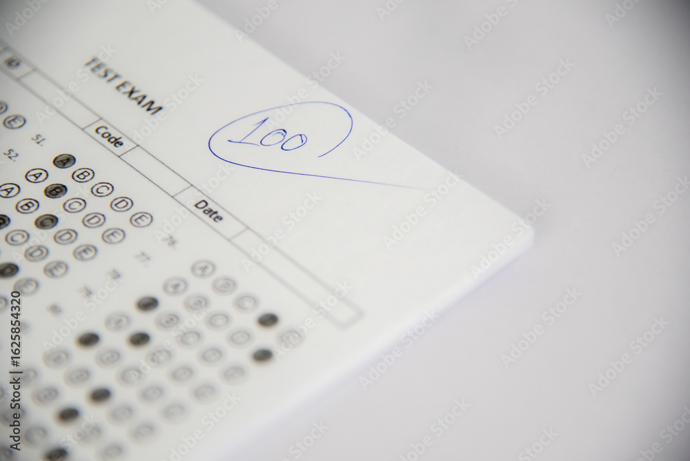 shows a hand holding a blue pen and writing the number "100" inside a circle on a test paper. The paper appears to be a completed multiple choice answer sheet, with some of the circles filled in.