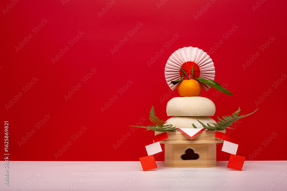 本物のお餅“鏡餅"を右側に配置した写真 紅白背景 低い三宝(台座)あり