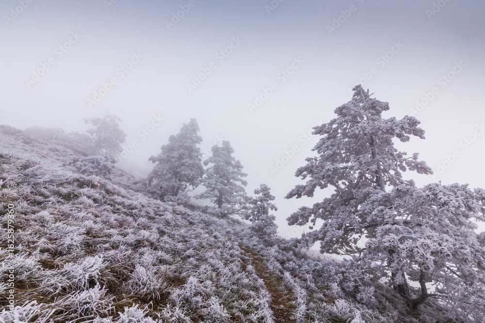 Frost covered black pine trees and fog in a wild mountain area in Eastern Europe