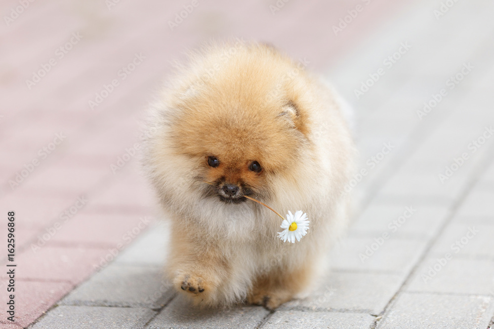 Confident puppy of breed German Spitz bears chamomile in his teeth
